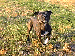 Box work: Get a big fluffy pillow and lay it on the floor. Stand beside the pillow with the ball or a treat and entice the dog to put its feet on the pillow. As soon as the feet hit the pillow, the dog gets the treat and/or you throw the ball away from the pillow so that the dog has to turn and go back the way he came. Try to wean the dog from the treats to chasing the ball if you begin with treats. After a few repetitions of this begin telling the dog "go push" as you lure it over to the pillow. If the dog begins to stop short of the pillow, back up and start over making your lure very obvious over the pillow. Once the dog really understands this command, begin standing away from the pillow and sending the dog to the pillow as though it were the box with the command "go push". Again, you may have to start close (like 10 inches) and then work back from there. Eventually you can stand quite a ways away, aim the dog towards the pillow, give the command, and he will "go push". The idea with throwing the ball is to get the idea in the dog's mind that when he hits the pillow/box to get off of it asap and get his ball. By patterning the behavior, you should get a dog who will easily transfer the push to a flyball box and not spend any time hanging on the box after getting the ball. In fact, Jazz has caught the ball over her shoulder on occasion when the box has been too slow and she's already leaving the box when the ball came out! Needless to say, we now have a faster box!!! This behavior can transfer into a cute little game if you want to amaze your non-Stafford friends. I'll point to my hip and tell Jazz "Push" and she will leap up and do a box push on me! I constantly hear "Wow, she can really jump".